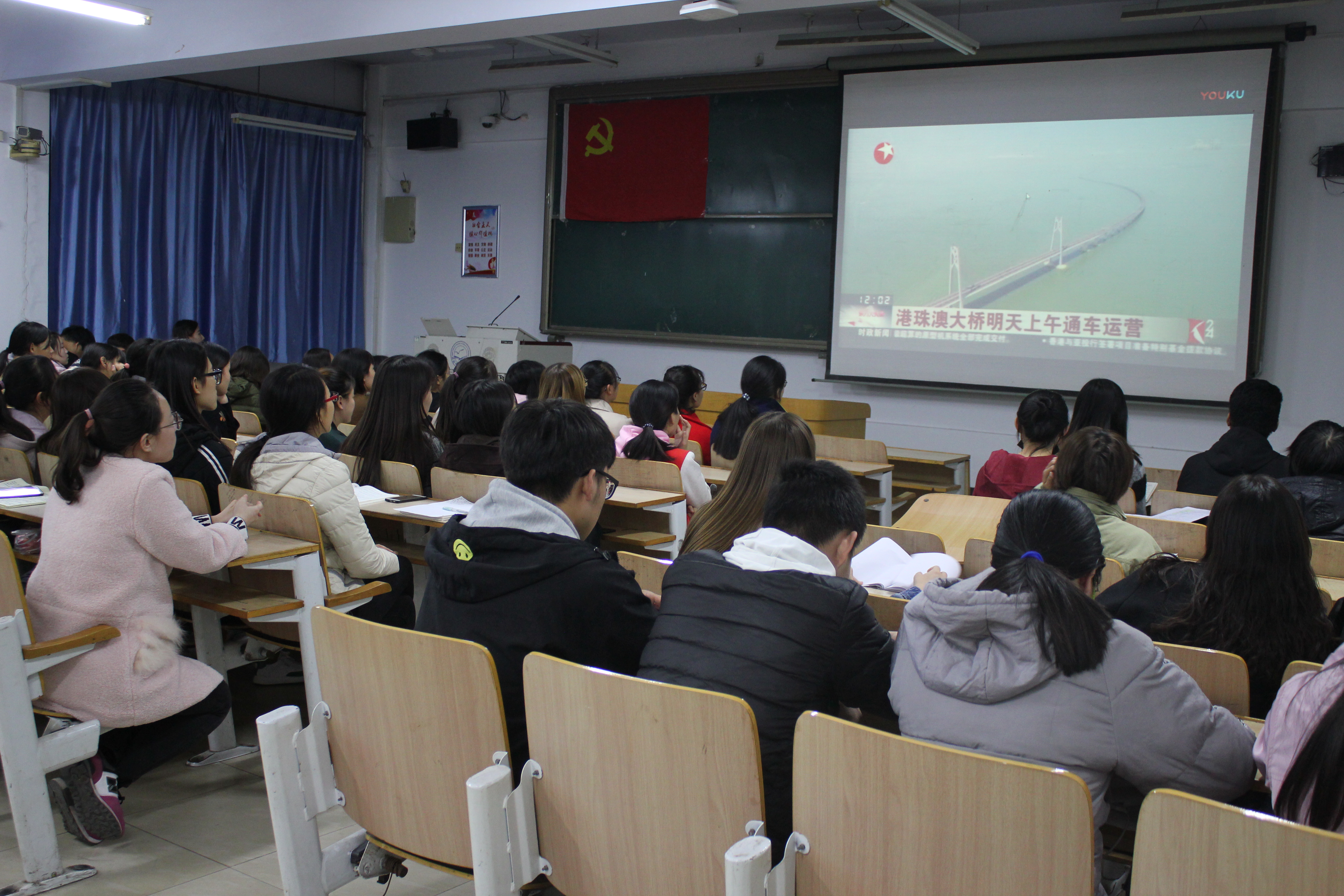 2018年10月23日上午,港珠澳大桥开通仪式在珠海公路口岸举行。世界上第一跨海大桥——“港珠澳大桥”正式建成通车,为全世界瞩目。为庆祝我国桥梁建设事业这一伟大壮举,弘扬中华民族艰苦奋斗、自力更生的崇高精神,感怀改革开放的历史性成就,增强民族自豪感。10月28日晚,Beat365唯一官方网站党委分两场组织青年学生党员、入党积极分子和共青团员观看了大型纪录片《港珠澳大桥开通仪式》和《港珠澳大桥》等视频资料,300名学生参加了活动。