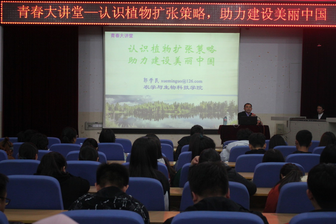 学院植物学教授郭学民老师从植物学的专业角度做了以“认识植物扩张策略,助力建设美丽中国”为主题的讲座,并从“美丽中国”、“认识植物扩张策略”、“助力建设美丽中国 ”三方面展开。